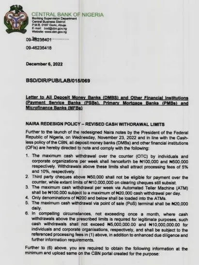 “Further to the launch of the redesigned naira notes by the President, Major General Muhammadu Buhari (retd.), on Wednesday, November 23, 2022, and in line with the cashless policy of the CBN, all deposit money banks and other financial institutions are hereby directed to note and comply with the following: