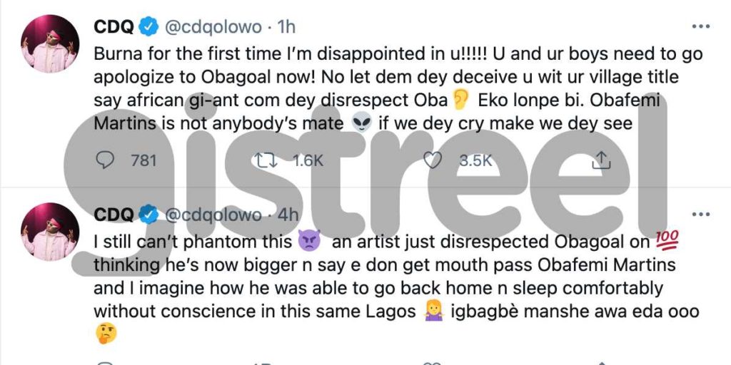 Rapper CDQ calls out Burna Boy on twitter, for allegedly disrespecting former Nigerian International, Obafemi Martins.