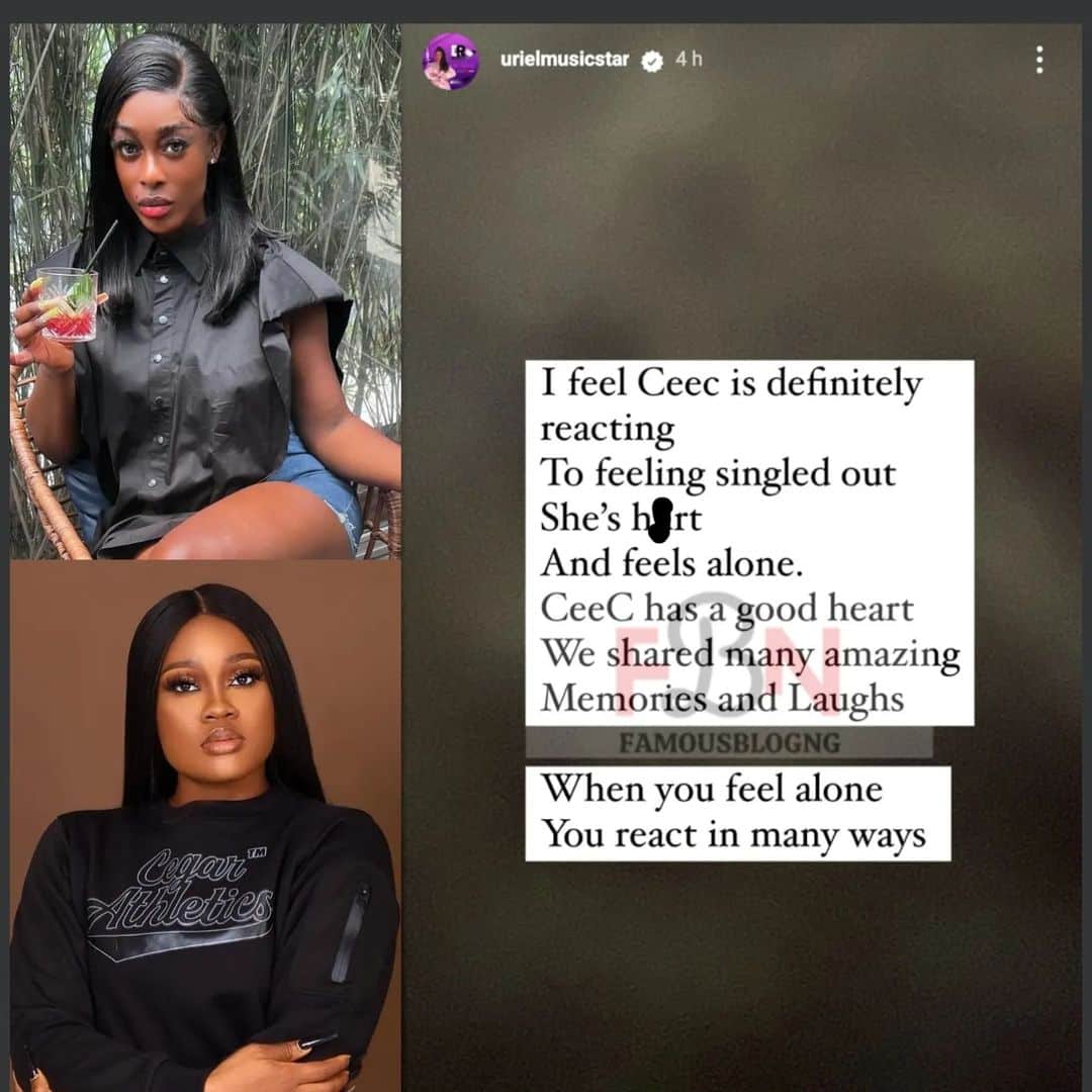 Former Big Brother Naija All Stars housemate Uriel has thrown her weight behind Ceec after her heat fight with Pere.