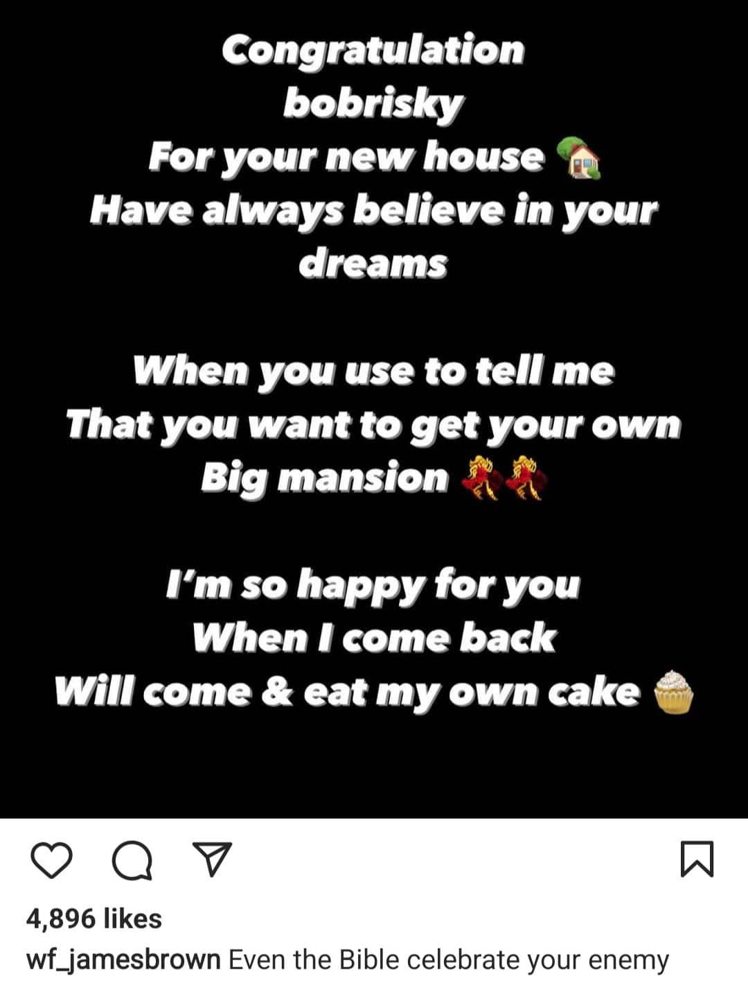 “Celebrate your enemy” – James Brown says as he congratulates Bobrisky on his new house