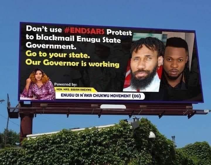 The billboard says, “Don’t use #EndSARS protest to blackmail Enugu State Government. Go to your state. Our Governor is working.”