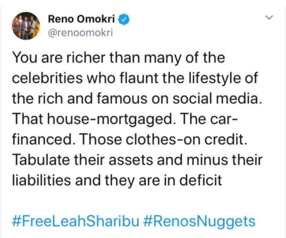 “Change your mindset”- Dabota Lawson reacts to Reno Omokri’s post about celebrities and their fake lifestyles