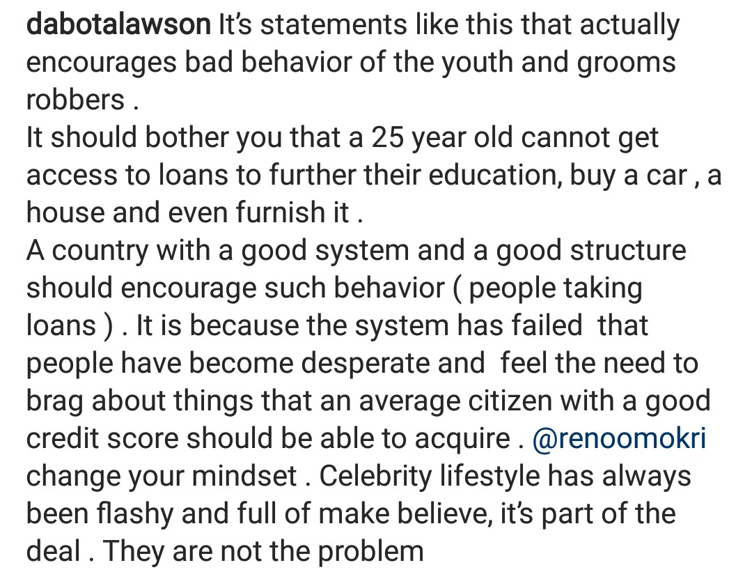Dabota Lawson, has called out popular Nigerian author and social commentator, Reno Omokri, after the latter made a post addressing celebrities and their fake lifestyles.
