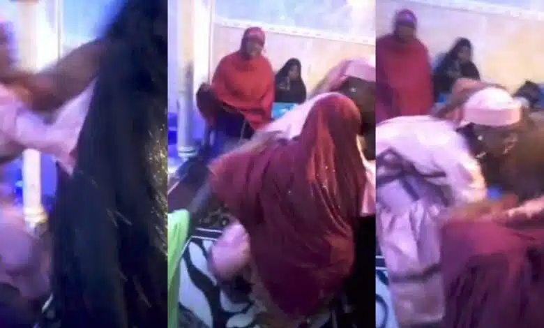A video online captures the moment a lady pounced on her husband’s second wife during their wedding.