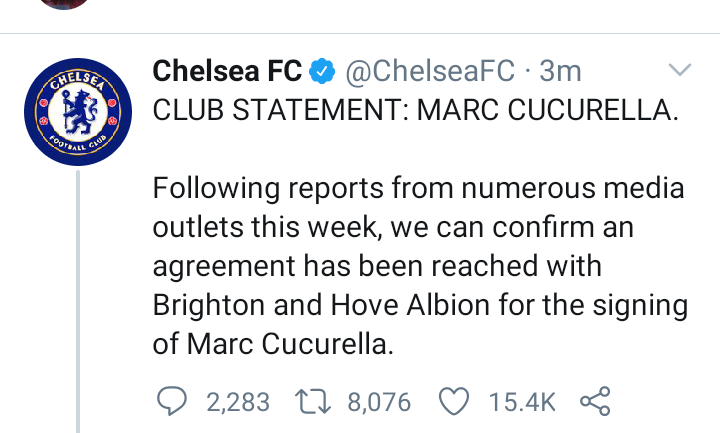 The statement, titled, “CLUB STATEMENT: MARC CUCURELLA,” reads: “Following reports from numerous media outlets this week, we can confirm an agreement has been reached with Brighton and Hove Albion for the signing of Marc Cucurella.”