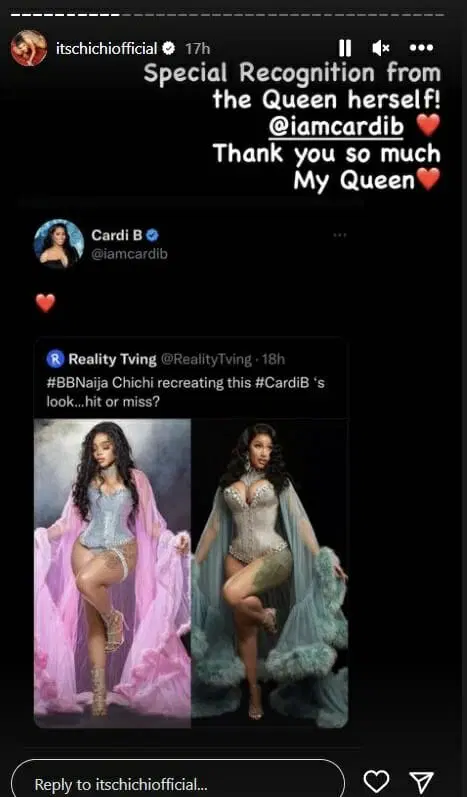 Big Brother Naija reality star Chichi has reacted to the “special recognition” by American rapper Cardi B.