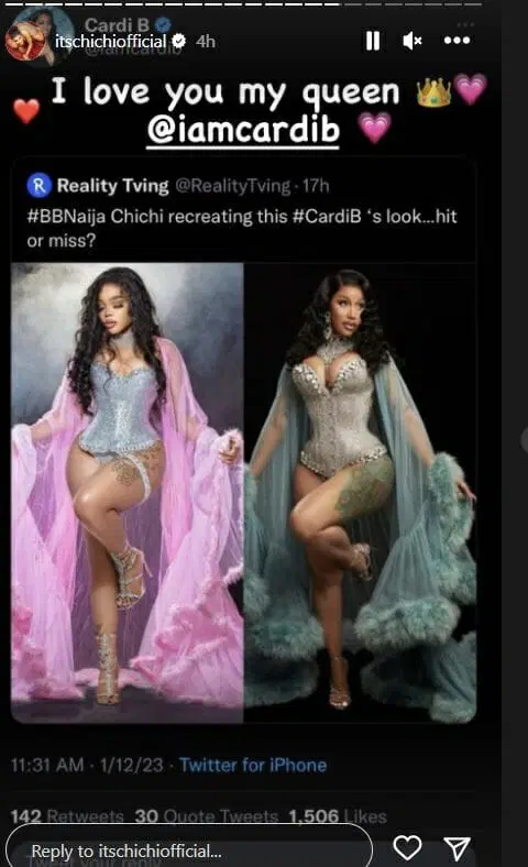In reaction, Chichi retweeted Cardi B’s post and captioned it, “Special recognition from the queen herself @iamcardib. Thank you so much My Queen. I love you my queen @iamcardib.”