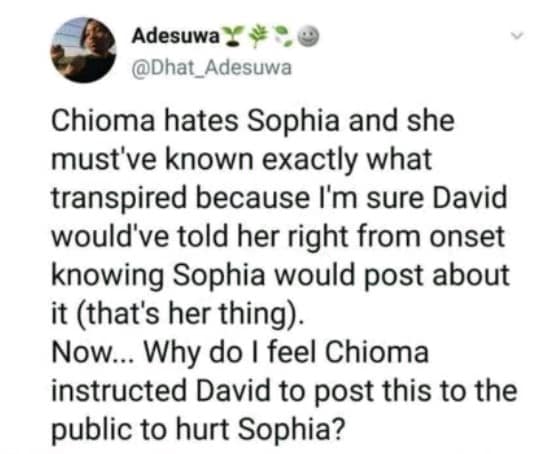 Subsequently, a social media user shared a post, saying that the whole thing was orchestrated by Chioma because she hates Sophia.