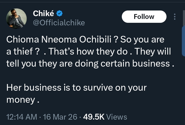 “Chioma, so you’re a thief?” — Singer Chike accuses a lady of defrauding him