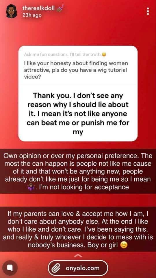 Davido’s fiancée, Chioma Rowland’s BFF, Kiku revealed she is bisexual via a Question and Answer session she had with some of her followers on Snapchat.