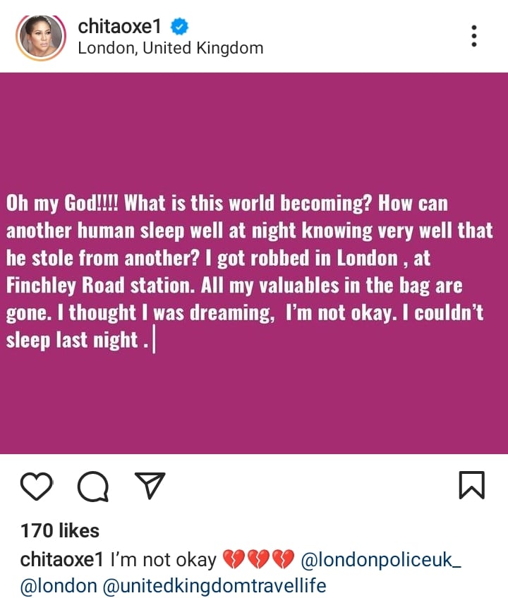 Chita Agwu said that she had been robbed in London, along Finchley Road station and the robber made away with her bag which contained all her valuables.