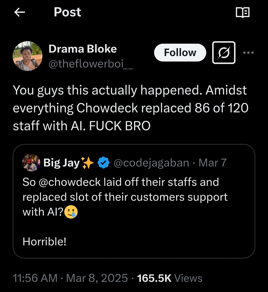 “You guys, this actually happened. Amidst everything, Chowdeck replaced 86 of 120 staff with AI. FUCK BRO.”