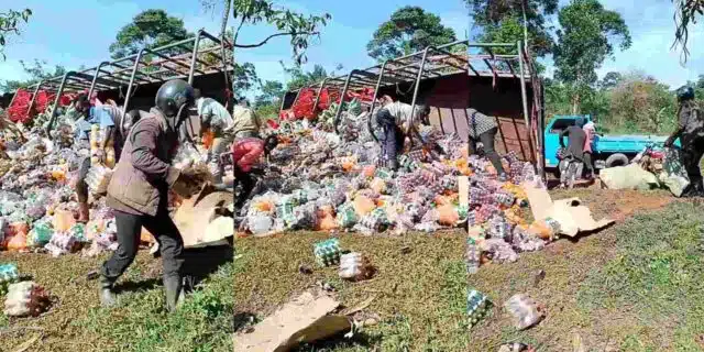 “Christmas came early” – Moment residents rush as truck fully loaded with soft drinks falls