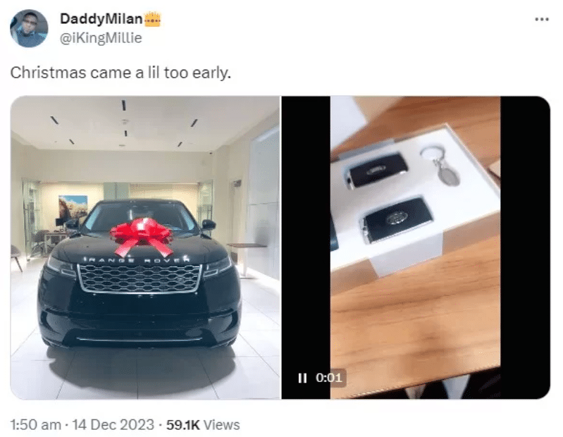 A young Nigerian man identified as King Millie has taken the internet by storm after proudly announcing his recent acquisition of a sleek black Range Rover, declaring Christmas has arrived ahead of schedule.
