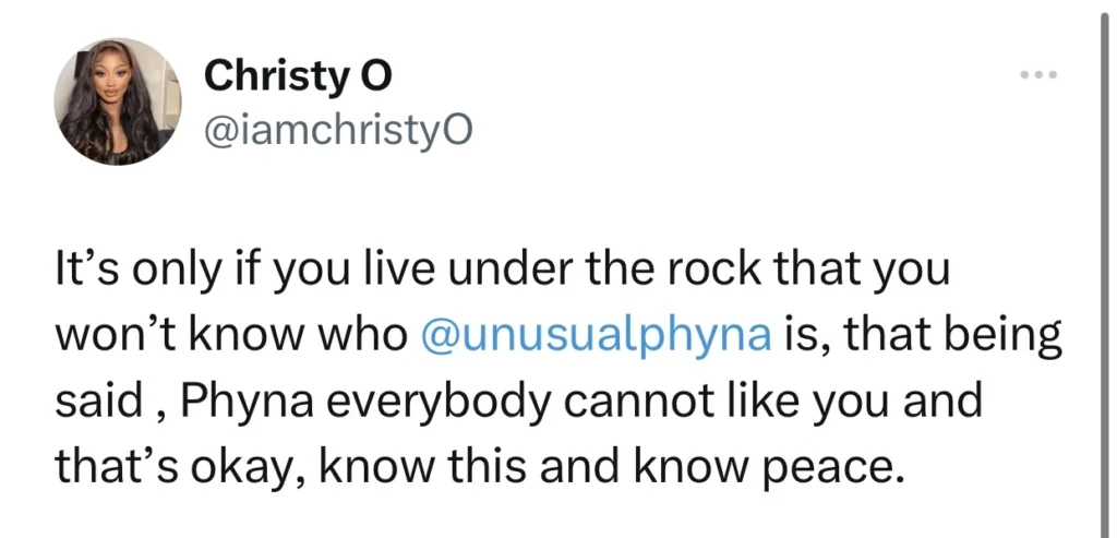 “It’s only if you live under the rock that you won’t know who @unusualphyna is, that being said , Phyna everybody cannot like you and that’s okay, know this and know peace.”