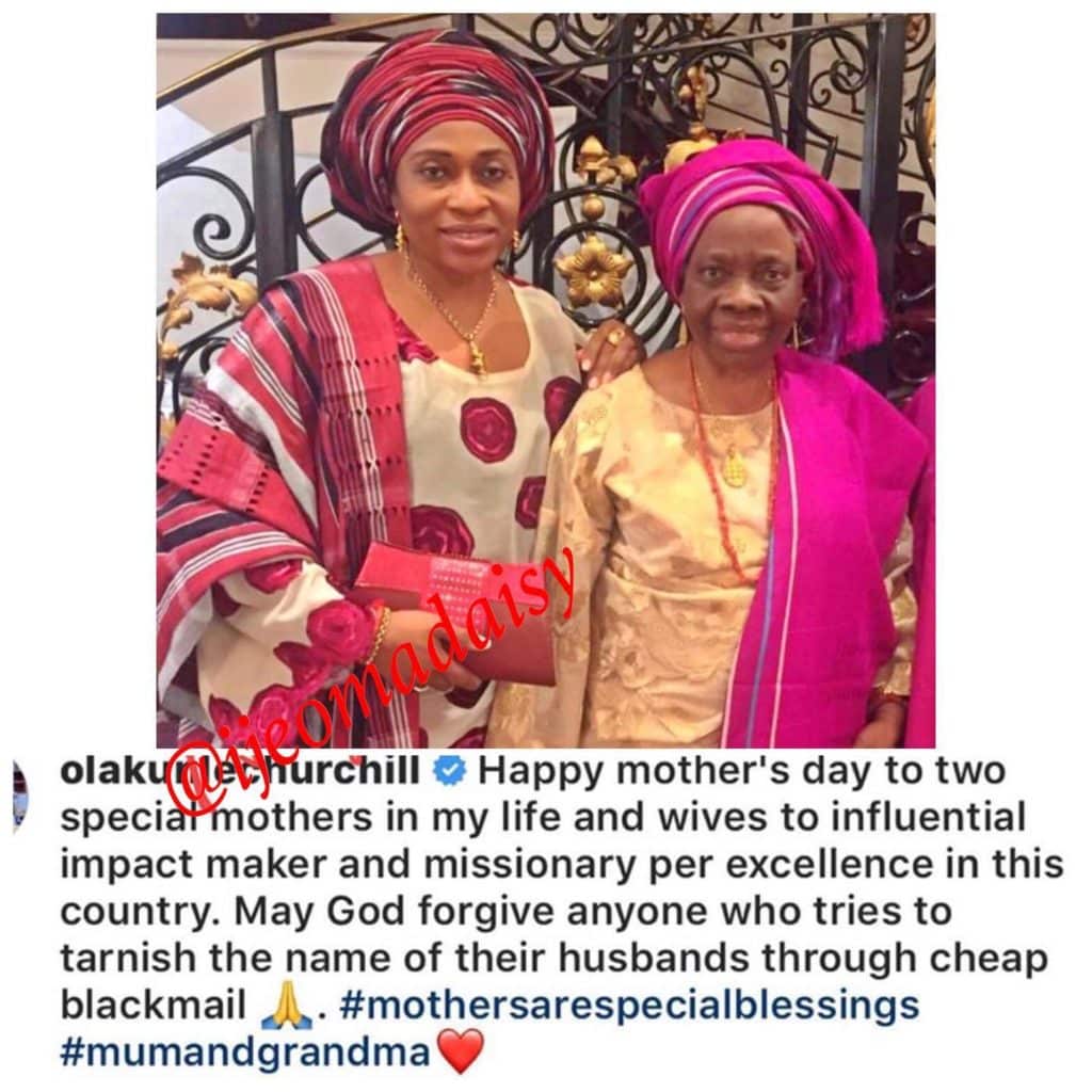 He did this in in a Mother’s Day message celebrating his mother and grand mother. His initial message reads: “Happy mother’s day to two special mothers in my life and wives to influential impact maker and missionary per excellence in this country. May God forgive anybody who tries to tarnish the name of their husband through cheap blackmail. #mothersarespecialblessings #mumandgrandma❤️”