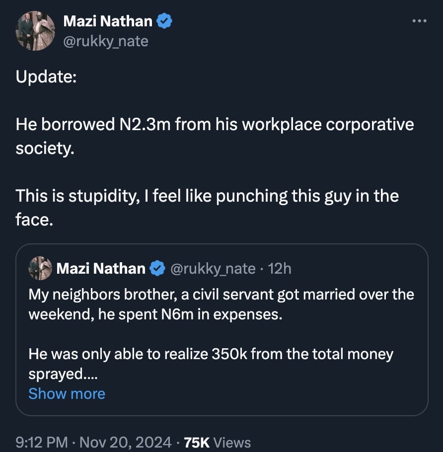 In another post, he added, “Update: He borrowed N2.3m from his workplace corporative society. This is stupidity, I feel like punching this guy in the face.”