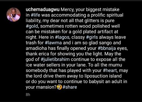 “Here in #lagos, classy #girls always leave trash for #lawma and i am so glad sango and amadioha has finally opened your #bbnaija eyes, thank erica for showing you the light. May the god of #julietibrahim continue to expose all the ice water sellers in your lane.