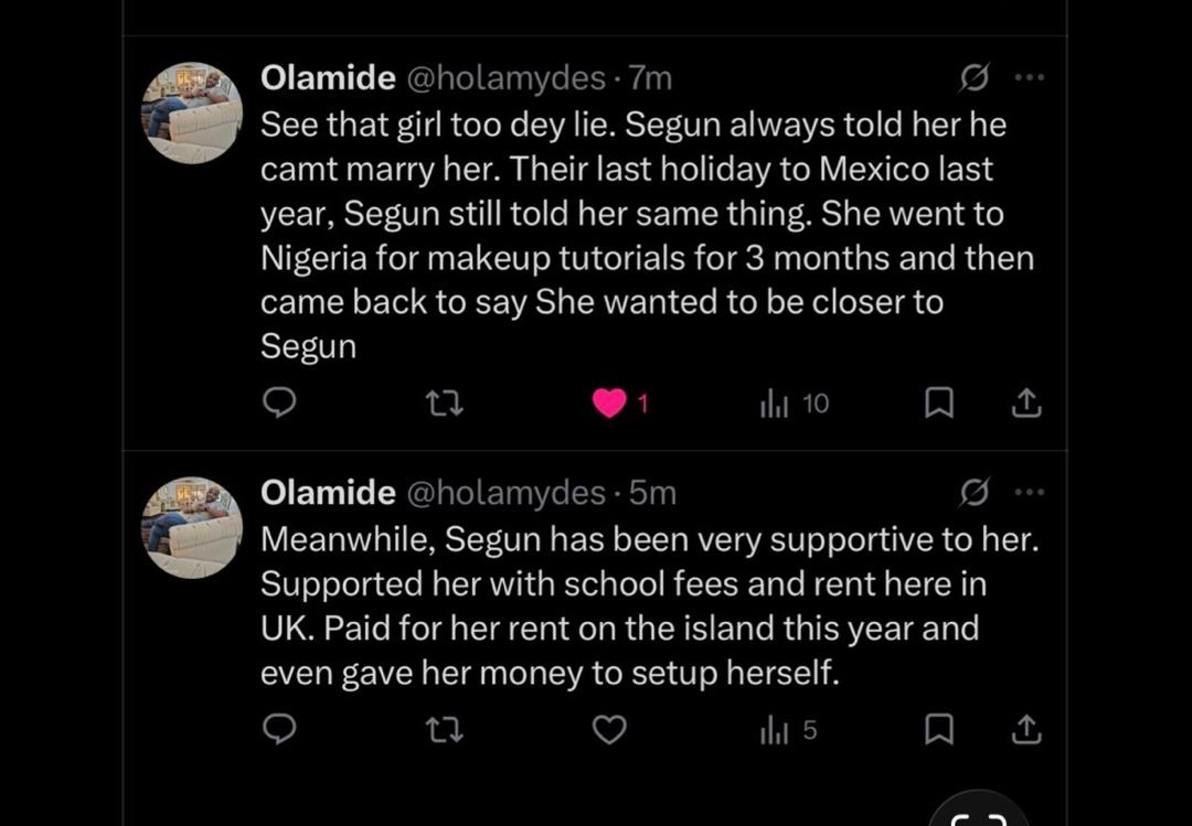 They further stated that Segun had financially supported her throughout the relationship — paying her school fees and rent in the UK, covering her rent on the Island earlier this year, and even giving her money to set herself up.