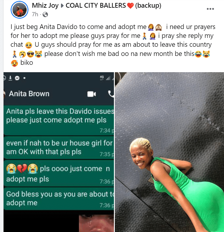 “I just beg Anita Davido to come and adopt me♀️ i need ur prayers for her to adopt me please guys pray for me♀️ i pray she reply my chat U guys should pray for me as am about to leave this country please don’t wish me bad oo na new month be this biko”