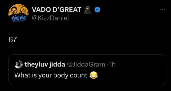 Another fan enquired, “What is your body count?” and Kizz Daniel simply wrote, “67.”