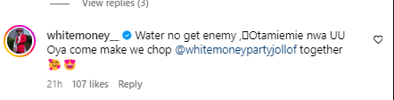 Whitemoney also took to the comment section to note that water has no enemy, while inviting her and folks to come eat his jollof rice.
