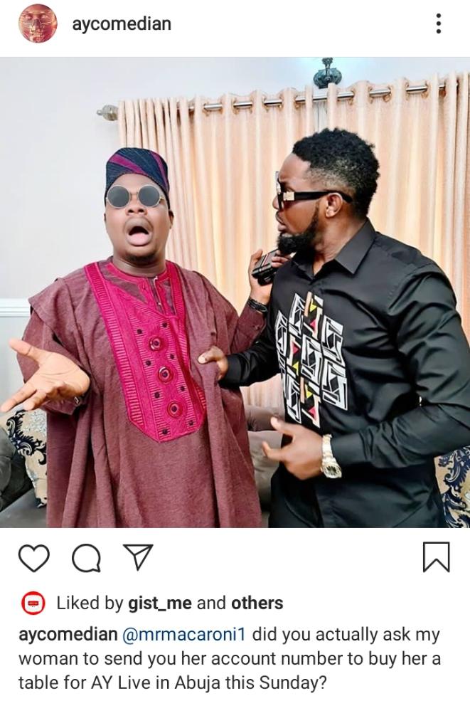 Nigerian comedian, Ayo Makun has dragged fellow comedian, Mr Macaroni for allegedly asking for his wife’s phone number.
