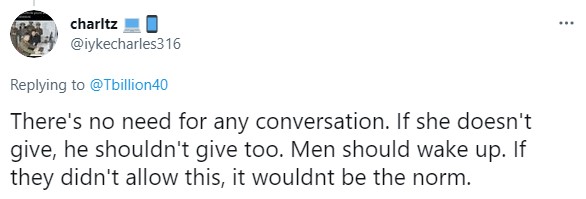The lady while raising this controversial issue noted that spending in a relationship shouldn’t be left within the confines of the man alone, rather it should be a reciprocal gesture.