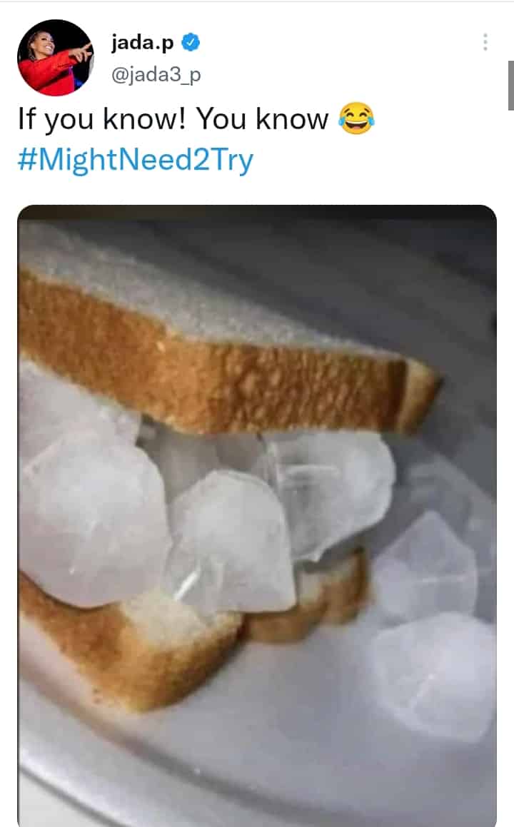 She took to her Twitter page to share a picture of a sliced bread with blocks of ice between them and hinted wanting to try the combination.