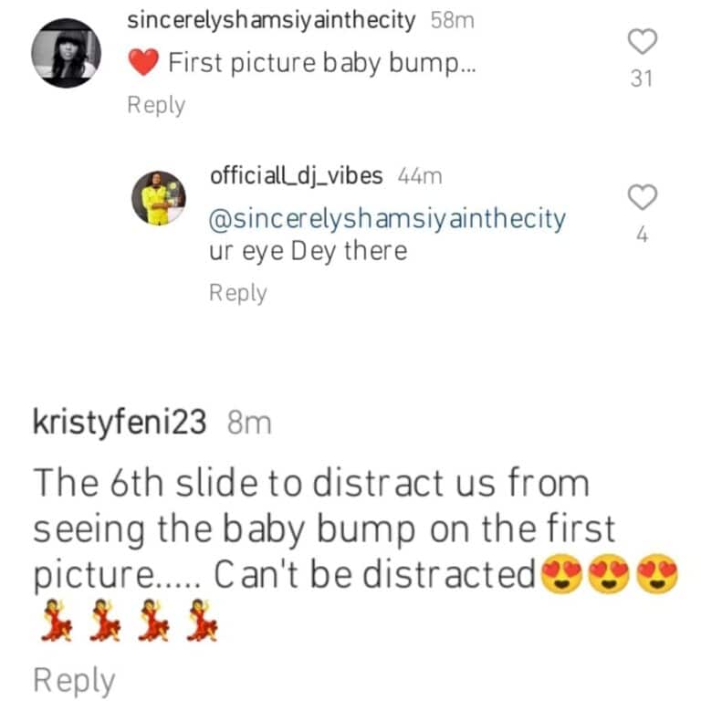 Kristy Feni wrote, “The 6th slide to distract us from seeing the baby bump on the first picture…. Can’t be distracted”