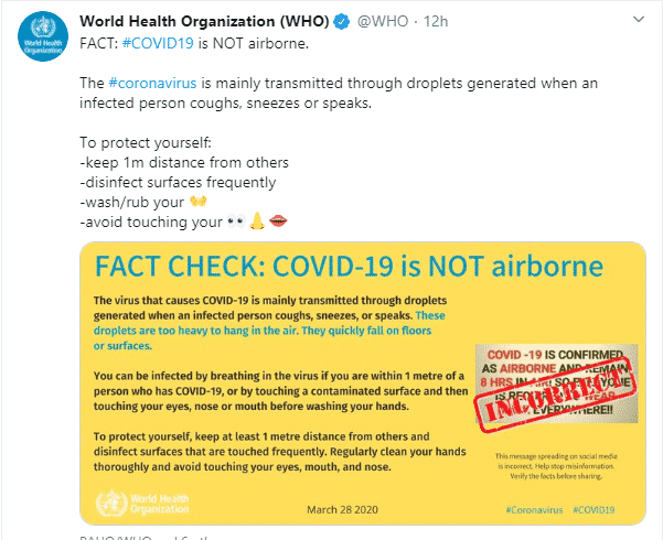 The World Health Organization (WHO) has debunked a myth which suggested that coronavirus is airborne and can remain in the air for 8 hours.
