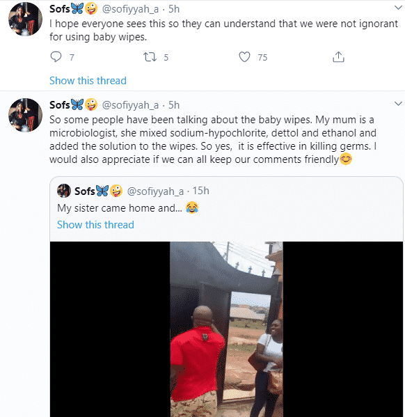 The Twitter user who shared the story revealed that her mum is a microbiologist and she mixed sodium-hypochlorite, Dettol and ethanol, and added the solution to the wipes to make it effective in killing germs.
