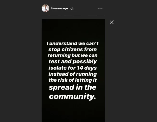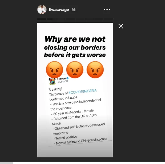 Sharing on Instastories, Tiwa Savage wrote: “Why are we not closing our borders before it gets too worse”.