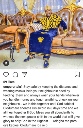 “Stay safe by keeping the distance and wearing masks, help your neighbour in need by feeding them and always wash your hands whenever you handle money and touch anything, check on your neighbour’s… we in this together until God kabiyesi Olodumare sheaths His sword in 6 days time and we all heal together !! God bless you all abundantly to witness the next power shift in the world that will give glory to only God in the Highest… Adagba ma paro oye Kabiyesi Olodumare Iba re o.”