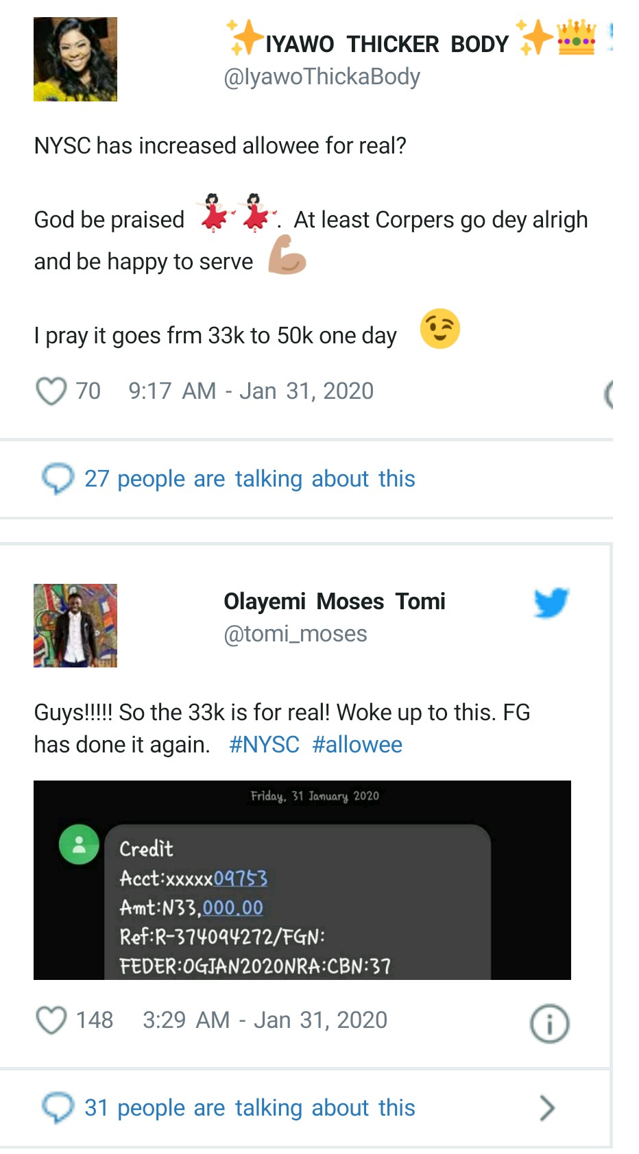 Corp members celebrate on Twitter as they reportedly receive N33,000 allowee