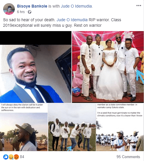 Friends and fellow corps members have gone on Facebook to mourn him.