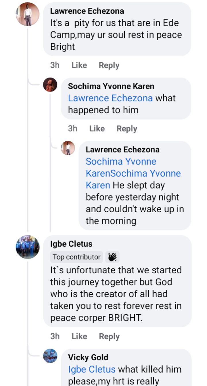 A young corps member identified as Bright has reportedly died in his sleep at the National Youth Service Corps (NYSC) orientation camp in Osun State.