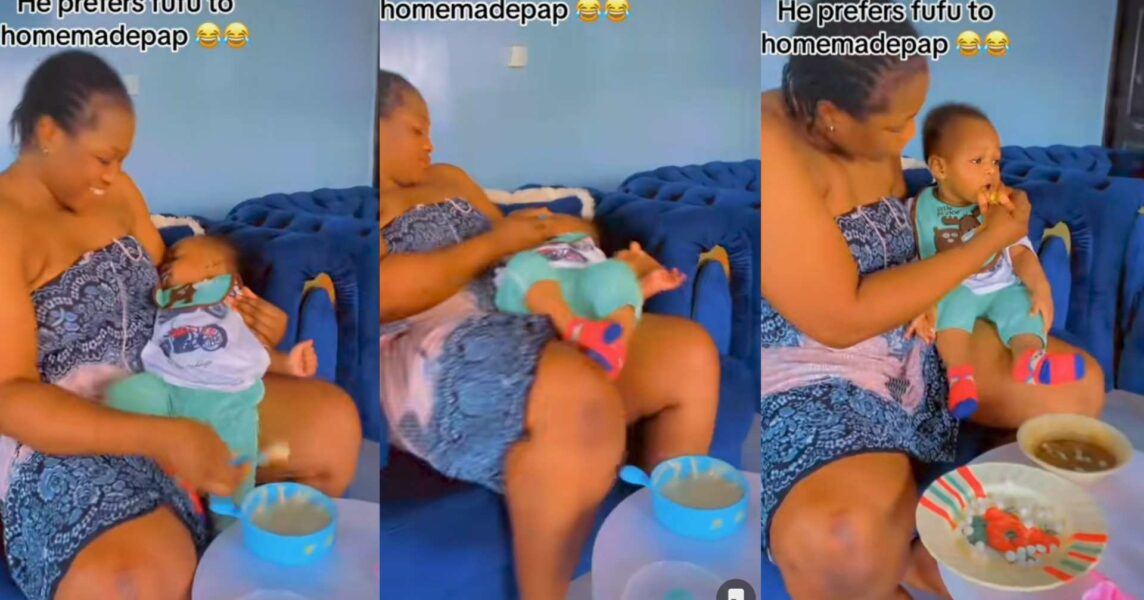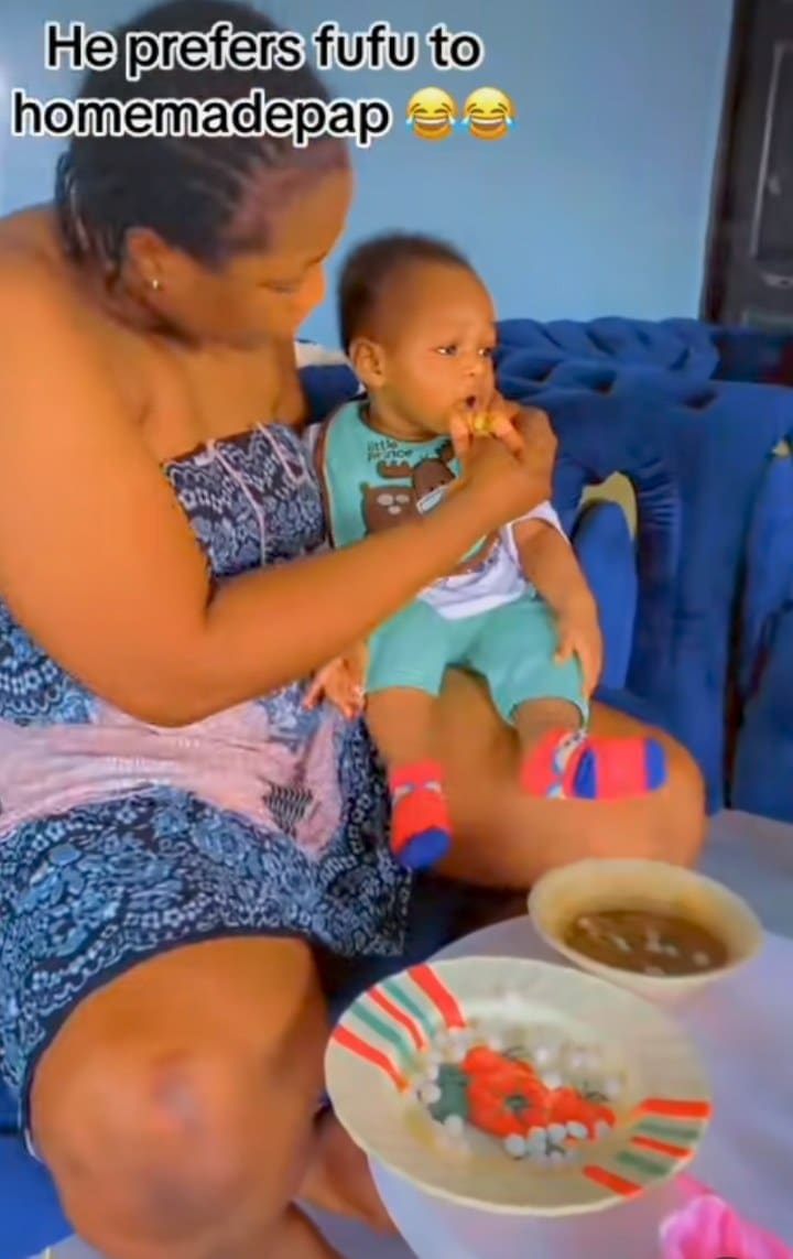 A little baby causes a buzz online over his preference for hard Fufu over a light homemade pap.