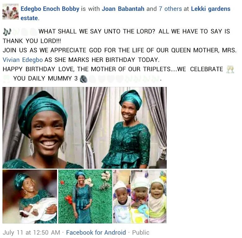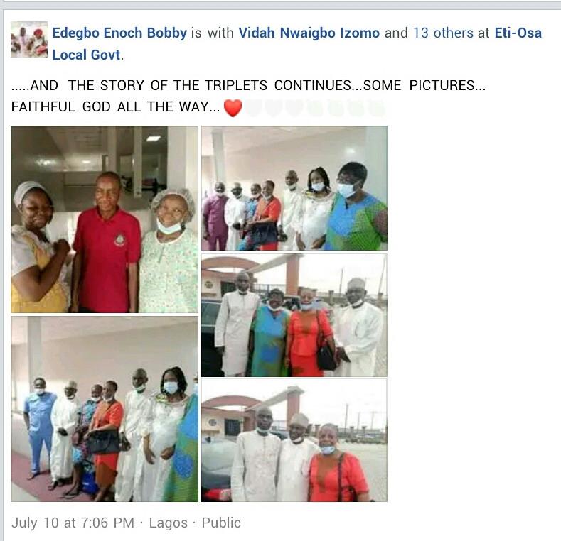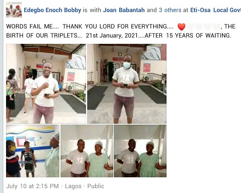 A man identified by his Facebook username as Edegbo Enoch Bobby alongside his wife has taken to social media to celebrate the birth of their triplets after 15 years of childlessness.