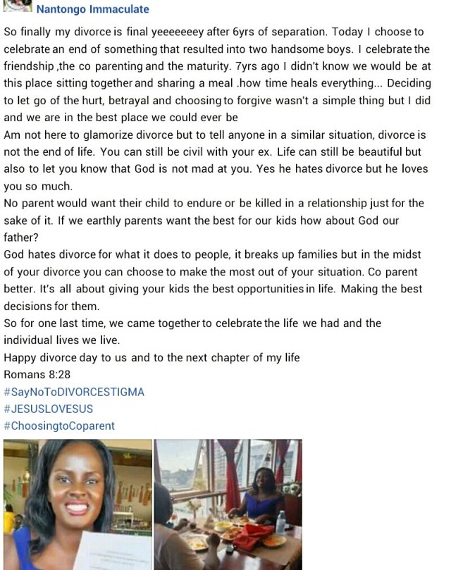 According to a Facebook user identified as Immaculate Nantongo, time heals pain and it is why she is able to forgive her ex-husband as the duo arranged a lunch to finalize their divorce in good spirit.