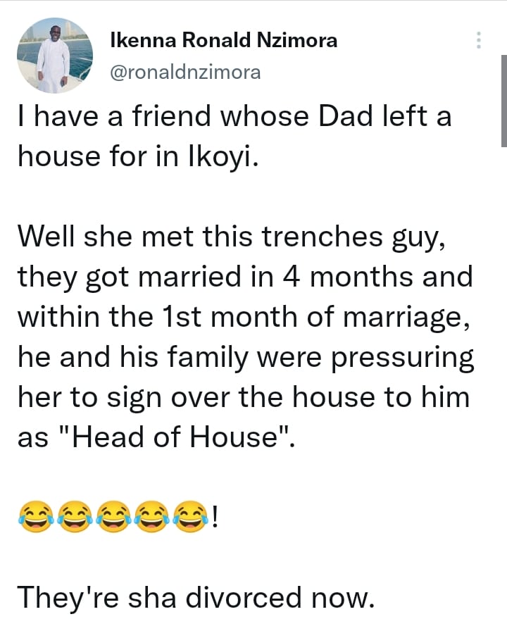 “I have a friend whose Dad left a house for in Ikoyi. Well she met this trenches guy, they got married in 4 months and within the 1st month of marriage, he and his family were pressuring her to sign over the house to him as “Head of House”. 😂😂😂😂😂! They’re sha divorced now.”