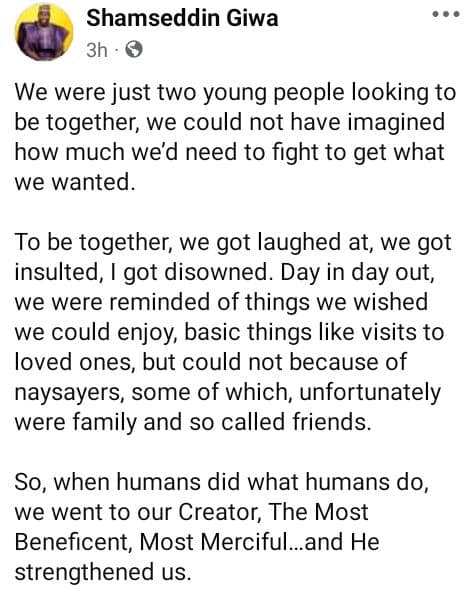 In a Facebook post, Giwa reflected on the challenges faced to be together, recalling how they were mocked and insulted, and how he was disowned by his family.