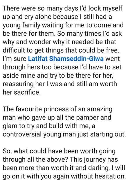 Giwa and his wife, childhood friends, are blessed with four children. He also revealed that Latifat came from a wealthy family but left that life behind to build a new one with him from the ground up.