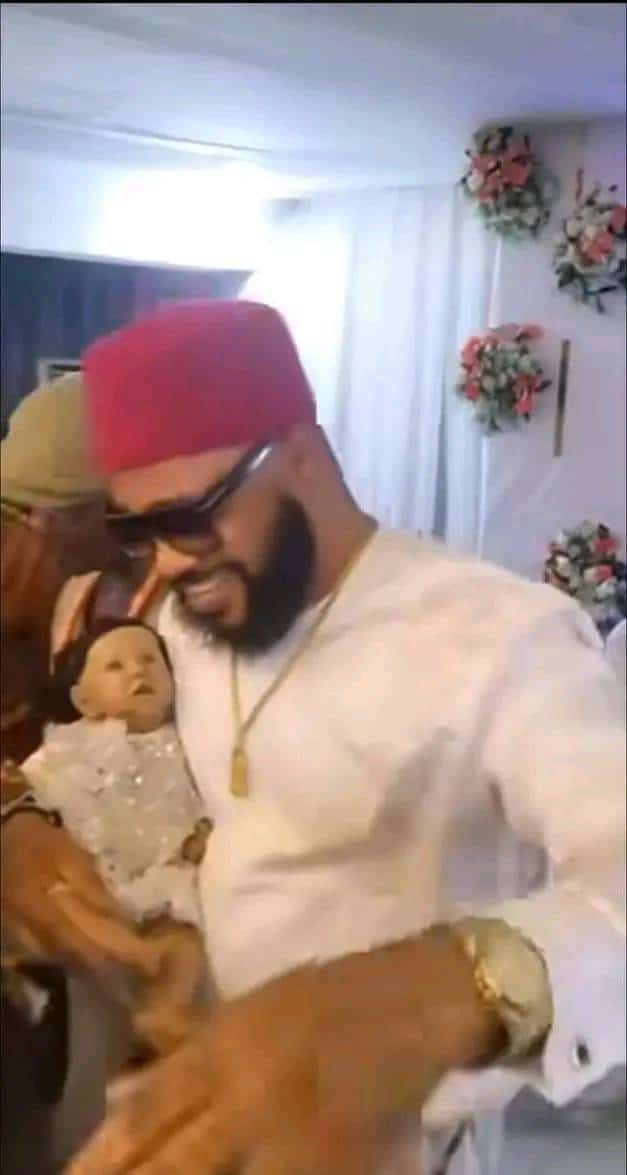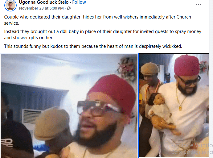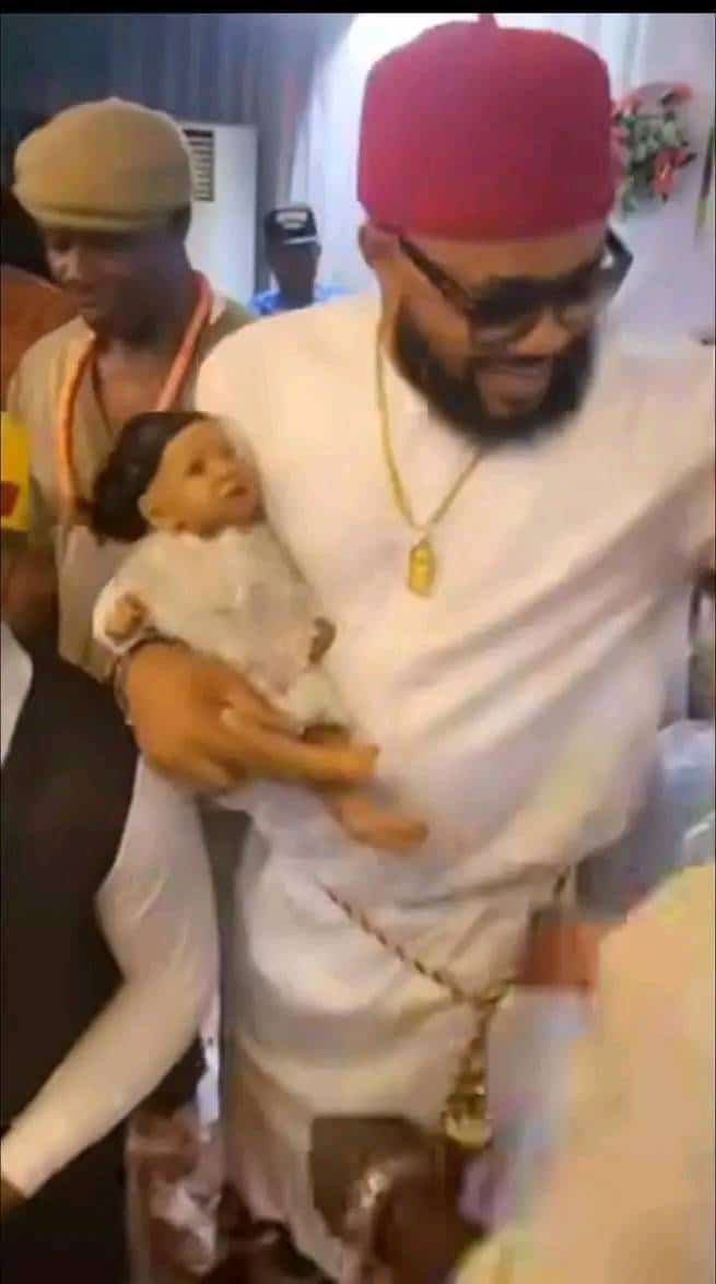 Couple stir reactions as they allegedly use a doll baby to stand in for their daughter during celebration with well wishers.