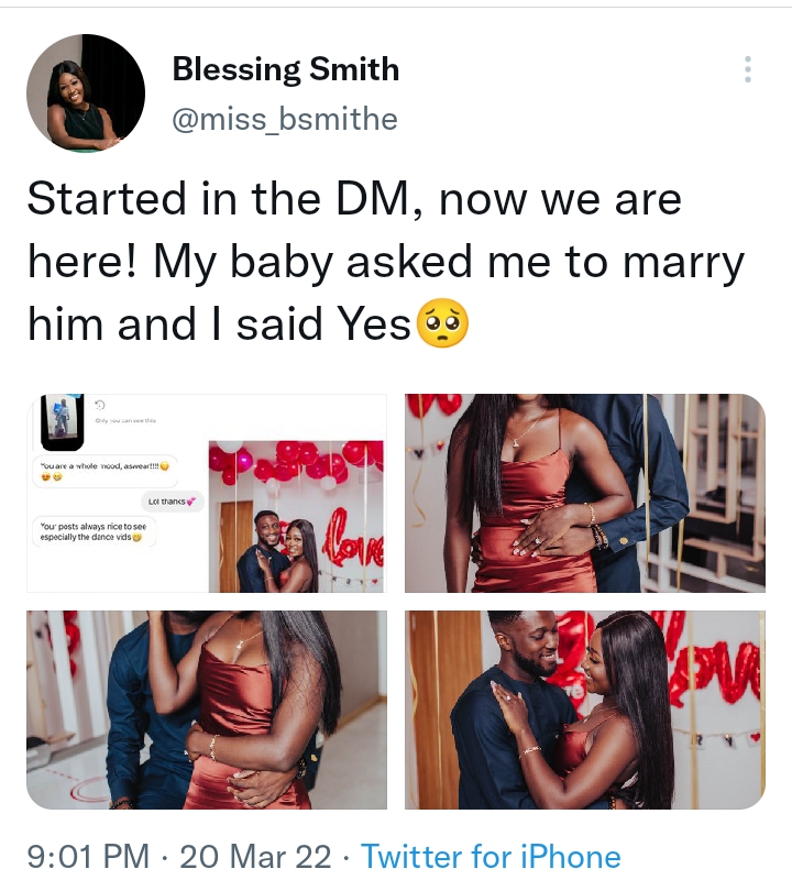 The lady Identified as Blessing Smith revealed the news after she said ‘Yes’ to her boyfriend.