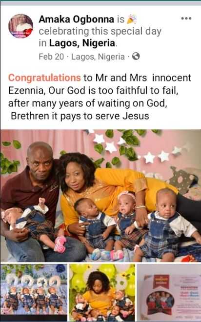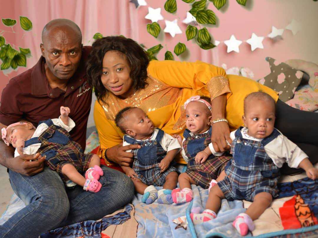 A couple, Mr Innocent and Mrs Onyinye Ezennia are excited as they welcome quadruplets after 12 years of waiting.