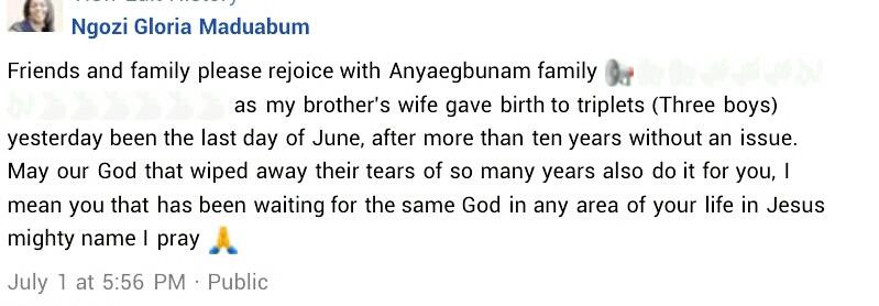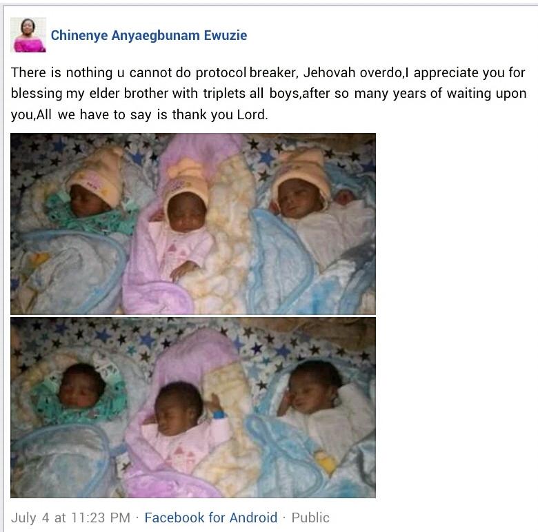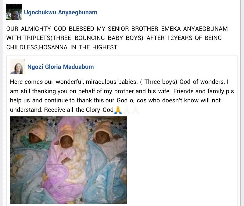 “OUR ALMIGHTY GOD BLESSED MY SENIOR BROTHER EMEKA ANYAEGBUNAM WITH TRIPLETS(THREE BOUNCING BABY BOYS) AFTER 12YEARS OF BEING CHILDLESS,HOSANNA IN THE HIGHEST.”