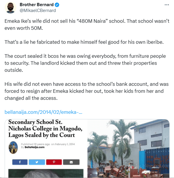 “Emeka Ike’s wife did not sell his “480M Naira” school. That school wasn’t even worth 50M.