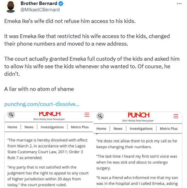Emeka Ike’s wife did not refuse him access to his kids.
