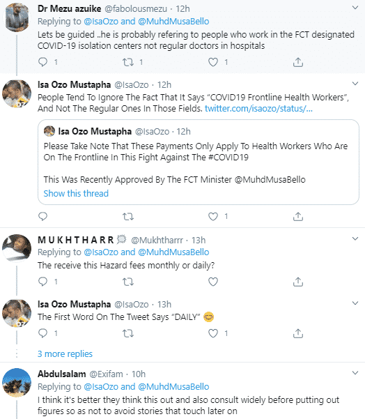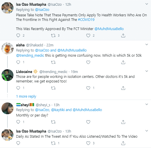 Following the announcements, doctors replied, stating that the 50,000 Naira only applies for those in the frontline in the fight against Coronavirus and the rest of them get only 5,000 Nairanper month, not per day.